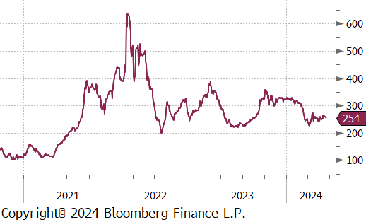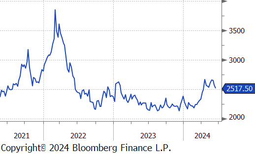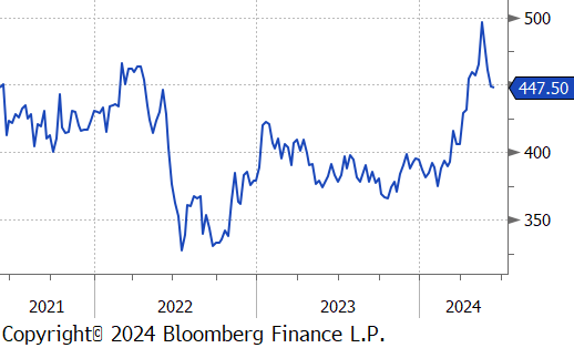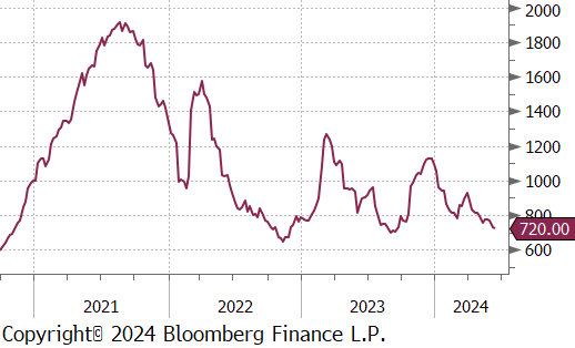 The 2nd month busheling future inched up by $5 or 1.2% to $415, while the busheling spot price sits at $380 – which is its lowest price since December 2022.