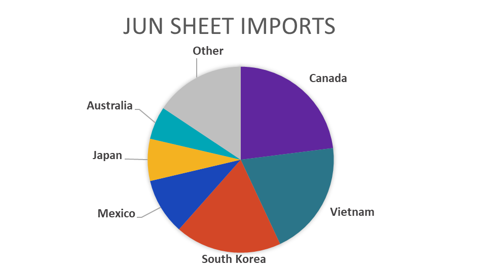 • Preliminary data for June sheet import arrivals point to a moderate easing, although arrivals remain at elevated level of imports. May’s estimate, is just above the 1M level for all sheet arrivals.