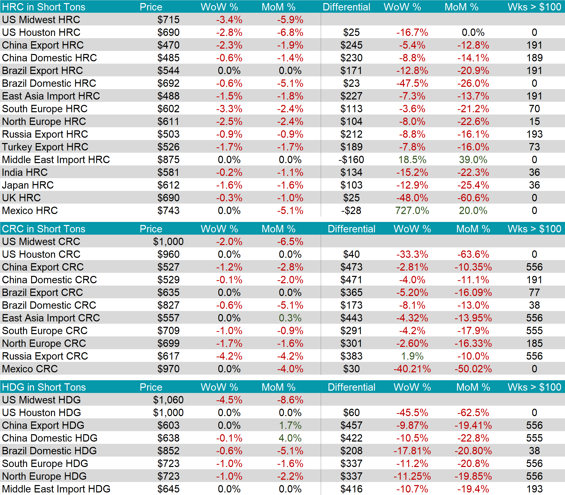 All watched global differentials all contracted. Biggest price movers this week were from South and North Europe HRC, declining by -3.3% and -2.5%, respectively. Also, the China Export HRC dropped by -2.3%.
