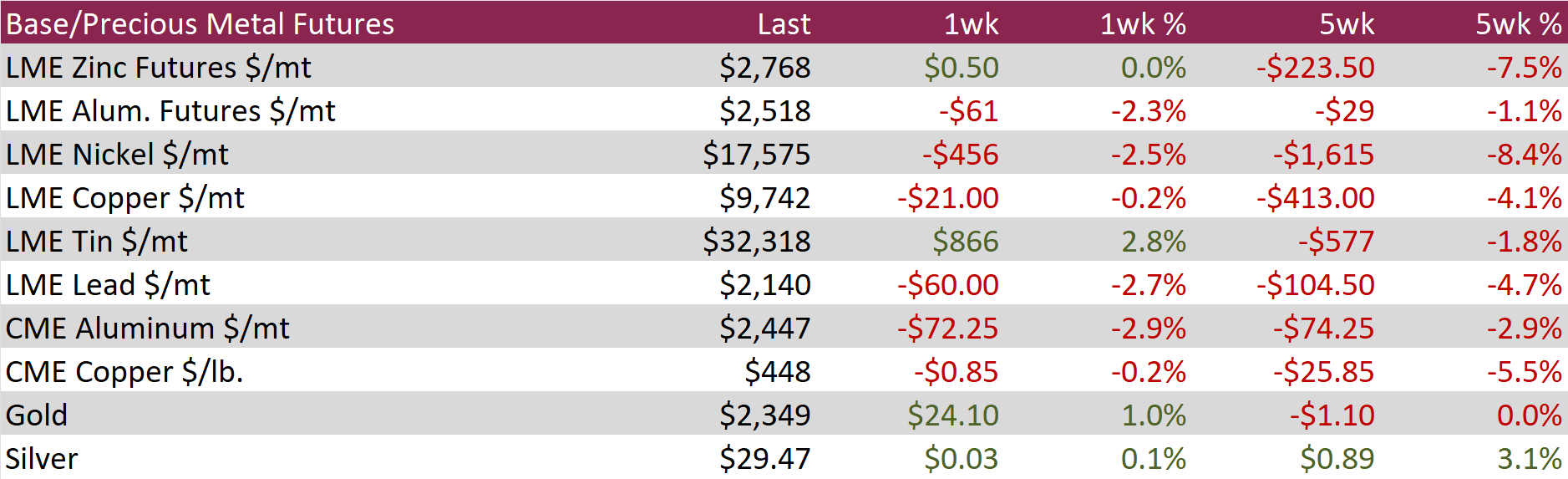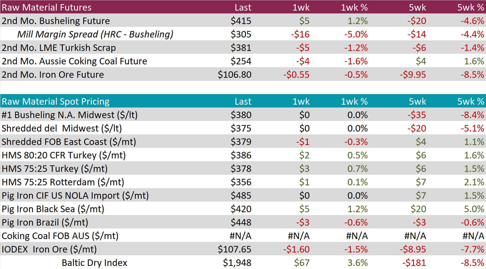 • Raw materials and their futures were mixed this week. The busheling future bounced off its lowest level since November 2022.