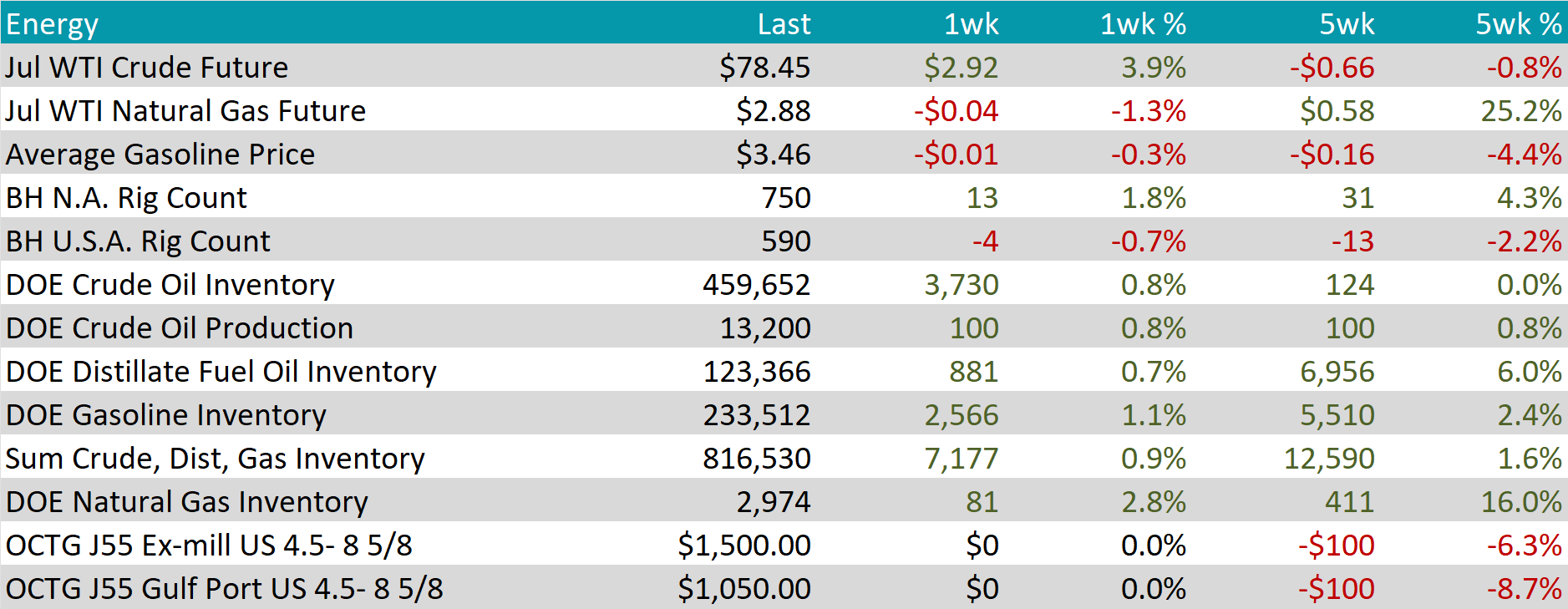 • The crude oil future experienced a gain, while the natural gas future fell. This occurred as the aggregate inventory level reached its highest since March 2023, and the NA rig count grew.