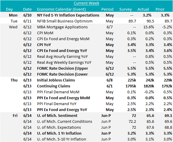 Both CPI (Consumers) & PPI (Producers) inflation data were released this week and provided encouraging signals after MoM readings remained stubbornly higher to start the year. May Topline CPI YoY came in at 3.3%, down from last months 3.4% and below an expected flat print. The disinflationary move was even more pronounced for Core CPI YoY, printing down to 3.4%, below the expected 3.5% and well under the 3.6% from April. May’s Core PPI YoY was also encouraging, printing down to 2.3%, down from last month’s 2.4% reading and in stark contrast to the median forecaster expectation of a resurgence to 2.5%.