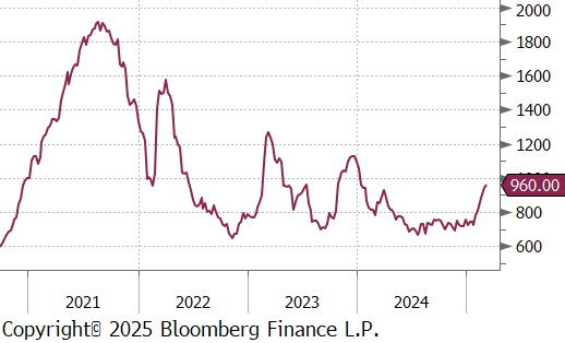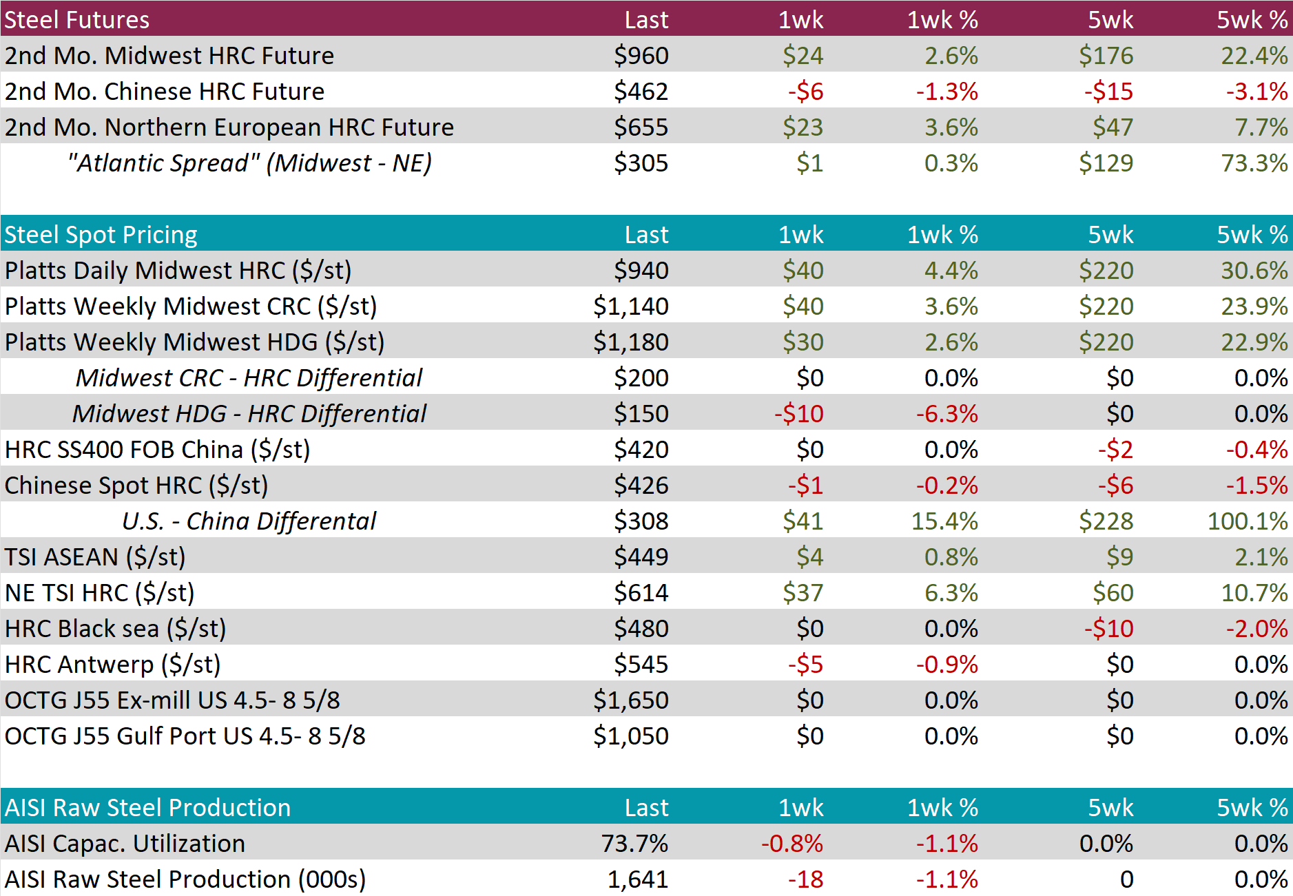 The HRC spot price increased for the seventh consecutive week, rising by $40 or 4.4% to $940. At the same time, the HRC 2nd month future rose by $24 or 2.6% to $960, the highest since January 2024.