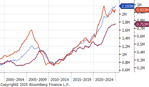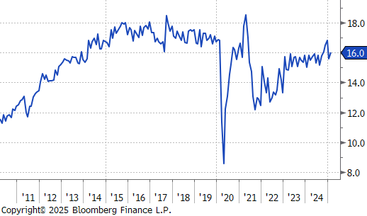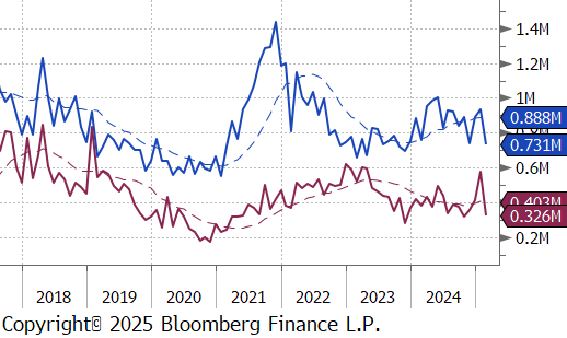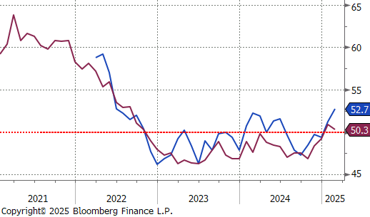 At the beginning of any new presidential administration the question arises, when a new set of policies start impacting the data – historical analysis suggests initial volatility in surveys should be taken with a grain of salt for the first couple of months in year (say Q1), while hard data takes approximately 6 months (2H). In this case, however, Trump II will likely be different given the facts that (1) it is a return to the presidency, and (2) the policies are aimed to significantly reshape the structure of the economy in a unique way. Because of this we view hard data dated in April as the starting point for Trump II.