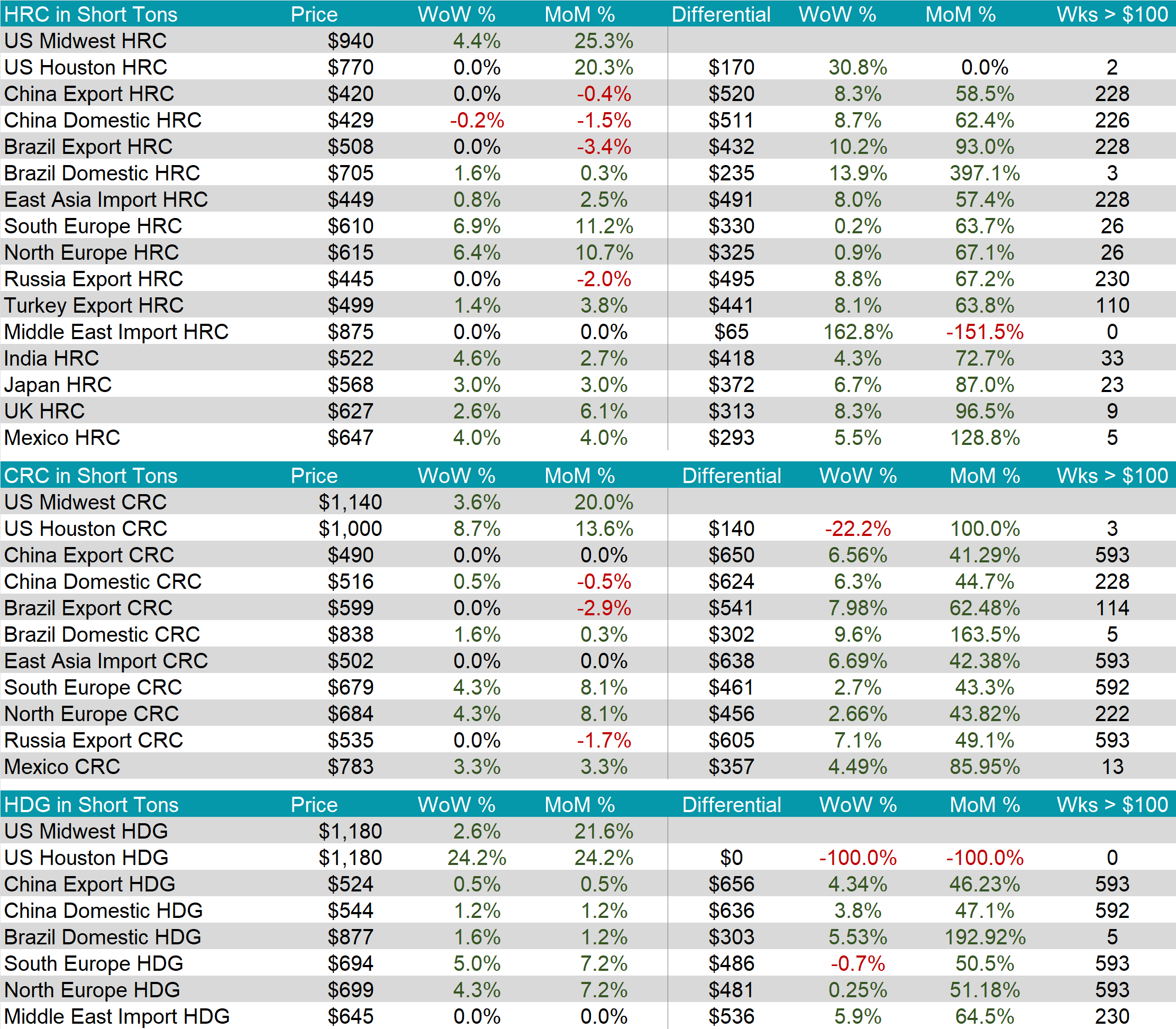 Tandem products both made gains, CRC up by $40 and HDG up by $30, resulting in the HDG – HRC differential to slump by $10 or -6.3% to $150.