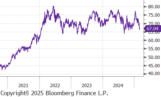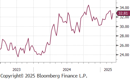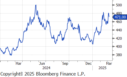 Copper futures rose by $9.15 or 2.0% to $471. Over the weekend, reports showed declines in both consumer and producer prices for February, reinforcing concerns about deflationary pressures in the world’s largest copper consumer. While Beijing has emphasized its ability to implement stimulus measures, the country’s economic outlook remains clouded by sluggish domestic demand and growing trade tensions with the United States. Last week, copper prices rallied to multi-month highs following former U.S. President Donald Trump’s proposal to impose a 25% tariff on copper imports. Such a policy shift could drive greater reliance on domestic production, but with the U.S. importing nearly half of its copper supply and operating only two major smelters, supply constraints could limit the effectiveness of reshoring efforts. This uncertainty adds volatility to copper markets, as traders weigh geopolitical risks against broader economic headwinds.