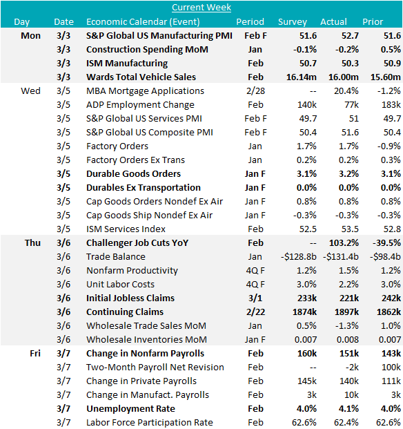 In the manufacturing sector, we saw continued expansion from February readings in both the S&P Global, and US ISM Manufacturing PMIs rising to (52.7, above the expected 51.6), and (50.3, below the expected 50.7), respectively. Underlying activity was mixed between the two but continues to suggest that manufacturing should continue improving well into the 2nd quarter. Final data for January durable goods new orders shows continued activity, up 3.2%, however, this was driven primarily by auto, with ex. Transportation coming in flat, at 0.0%. To that effect, February auto sales rebounded to 16m units sold (SAAR) after a disappointing decline in January at 15.6m, however, this was slightly below the expected 16.14m. From the underlying data, January showed a 41-month low for auto production, and a 17-month low for auto inventories.