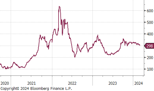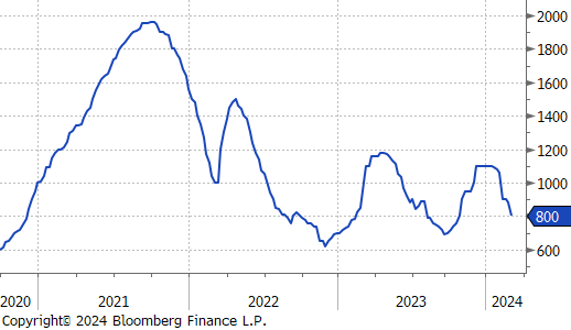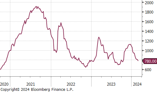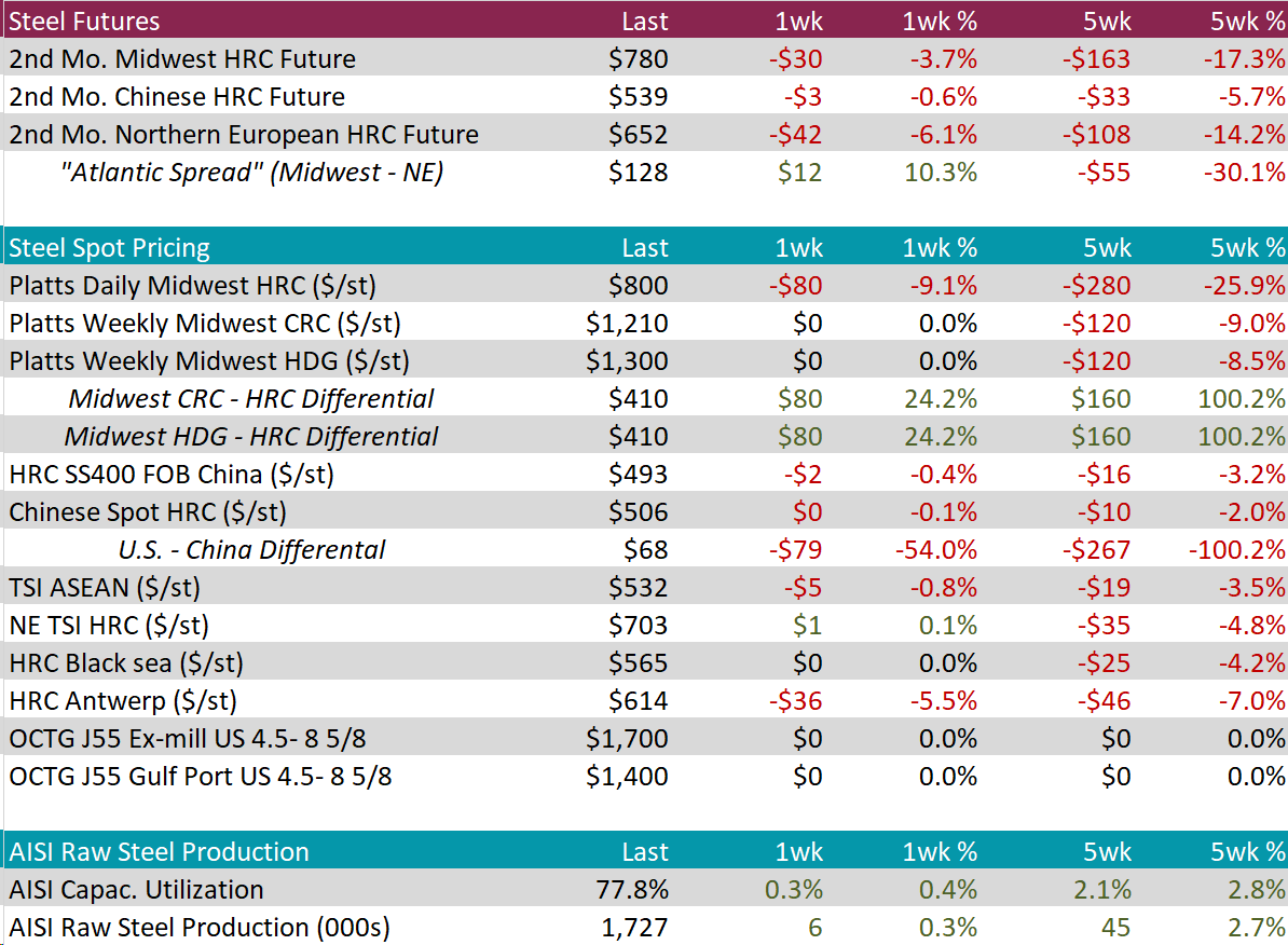 The HRC spot price declined further, falling by $80 or -9.1% to $800, marking a total of -$300 price decline since peaking at $1,100 seven-weeks ago. Meanwhile, the 2nd month future was down $30 or -3.7% to $780, reaching its lowest price since mid-October 2023.