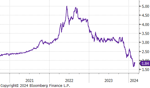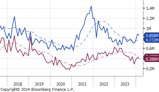 The PCE Deflator YoY came in at its lowest level since February 2021 at 2.4%, down from 2.6% the month prior, and in line with forecasts. The PCE Core Deflator YoY slightly slowed to 2.8% from December’s 2.9%, the lowest print since March 2021, in line with market expectations.