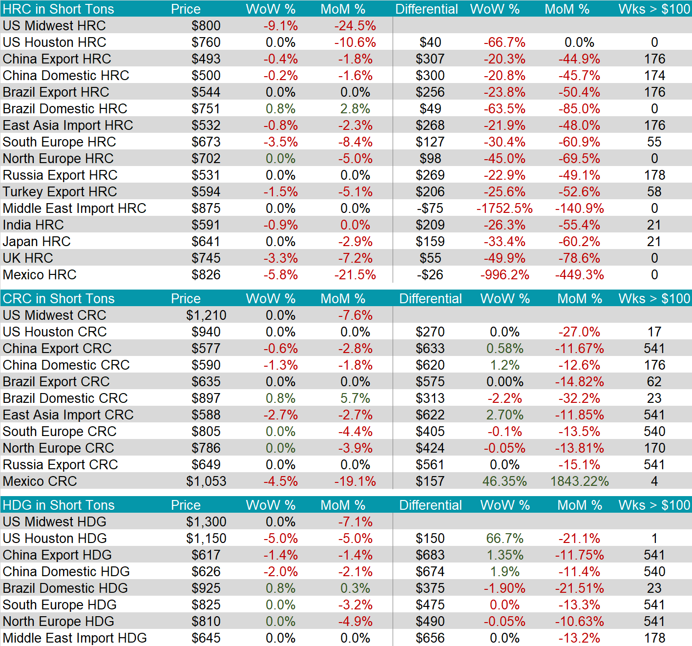 All watched global differentials contracted further this week, with the Europe HRC experiencing the biggest price decline of -3.5% and the Brazil Domestic HRC being the only price increase of 0.8%.