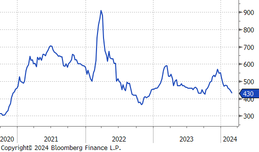 The 2nd month busheling future fell by $15 or -3.4% to $430, reaching its lowest price since early October 2023. Next week, the busheling spot