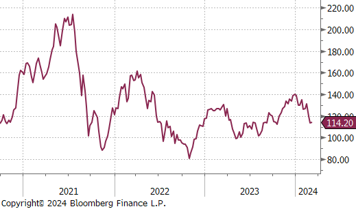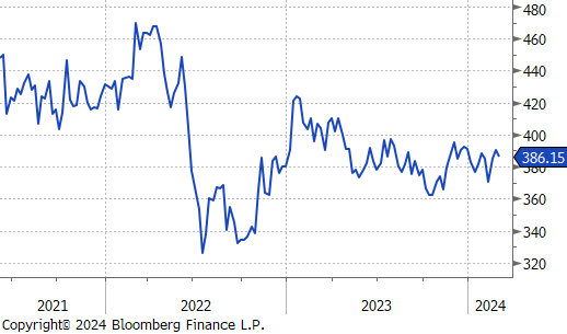 Copper fell by $3.90 or -1.0% to $386. This comes as Jiangxi Copper Co., a major Chinese copper producer, bolstered its stake in First Quantum Minerals Ltd. by purchasing $212 million worth of shares and has committed to buying $500 million in copper from First Quantum’s Zambian mine, underscoring a deepening partnership amidst efforts to offset losses from the Panama mine closure, which was a significant profit source. Furthermore, India’s Supreme Court has denied Vedanta Ltd.’s request to reopen its copper smelter, closed since 2018 for environmental violations, a decision that intensifies India’s reliance on copper imports amid rising demand. The ruling underscores India’s challenge in balancing economic growth and environmental sustainability, with domestic copper demand forecasted to nearly double by the end of the decade. This situation has attracted new investments, notably Adani Enterprises’ plan to establish a $1.2 billion copper production facility, signaling a shift in the country’s copper industry landscape amidst Vedanta’s operational and financial hurdles.