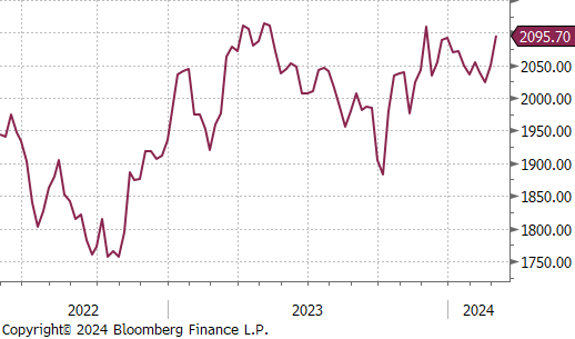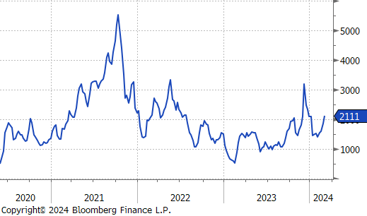 The Baltic Dry Index rose by $359 or 20.5% to $2,111, finally breaking back through the $2,000 price level as it continues to rally.