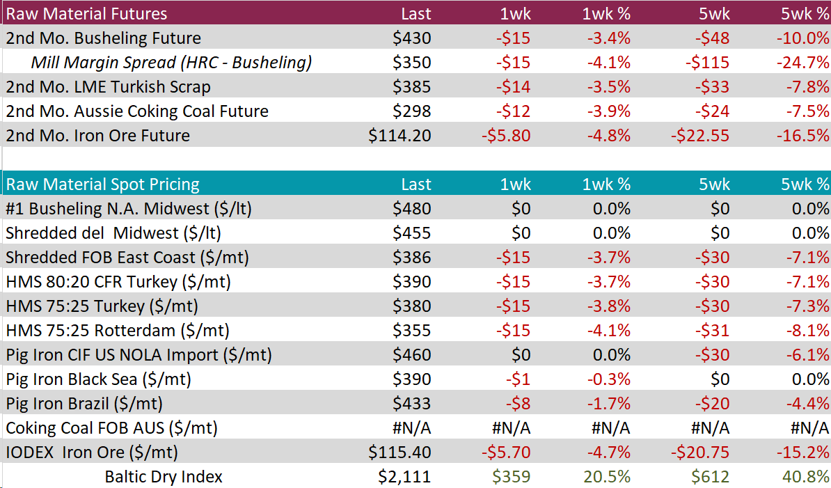 Mill production continued to ramp up from relatively low levels, with capacity utilization ticking up by 0.3% to 77.8%, bringing raw steel production up to 1.727m net tons.
