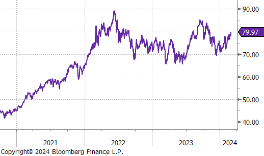 WTI crude oil future gained $3.48 or 4.5% to $79.97/bbl, nearly reaching the $80 price level and the highest it has been since November 2023.