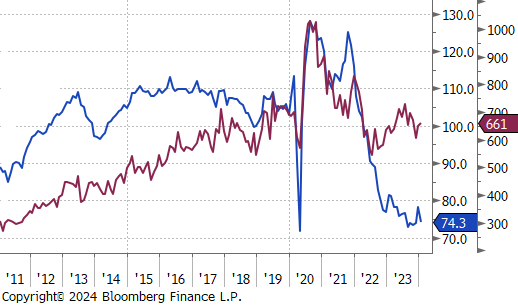 The labor market showed a clear signal of softening in this week’s data, with both Initial and continuing jobless claims coming in above expectations. While increasing, initial claims remains well below the threshold which would cause near-term concern for the broader market.