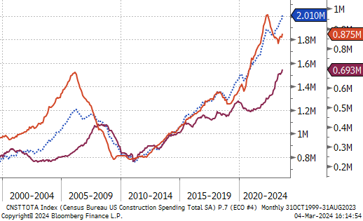 Construction Spending MoM was down -0.2% in January, it came in below the expected 0.2%, and down from 0.9% in December. This marks the first monthly contraction since December 2022, and was mainly driven by a downturn in public construction outweighing the slight increase in private spending.