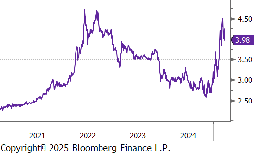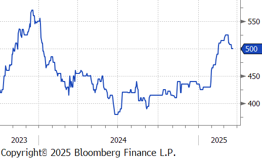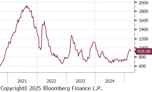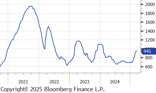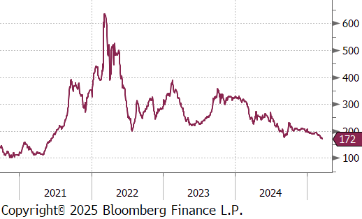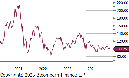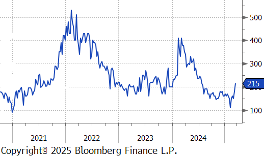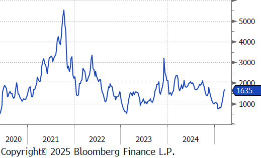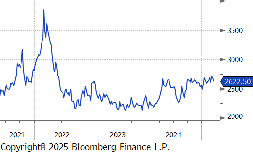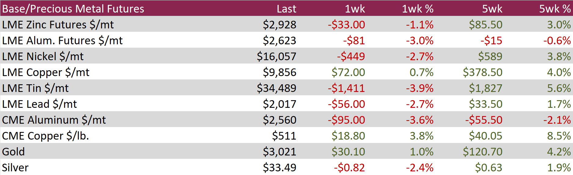 Aluminum futures dropped $81 (-3.0%) to $2,623 as raw material availability improved. Expanded alumina production in Guinea, Australia, and China pushed prices to one-year lows, aiding smelter efficiency. However, finished aluminum supply is set to tighten as China, after hitting a record 44 million tons in 2024, enforces its 45 million-ton cap to curb oversupply and meet carbon targets. Additionally, muted Chinese exports—following the removal of tax rebates—have lifted international prices as domestic sales take priority, reinforcing a more constrained global market.