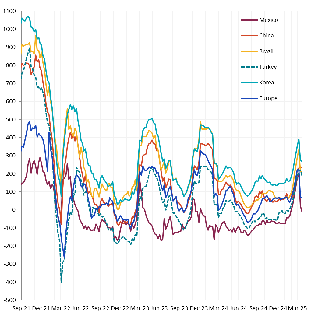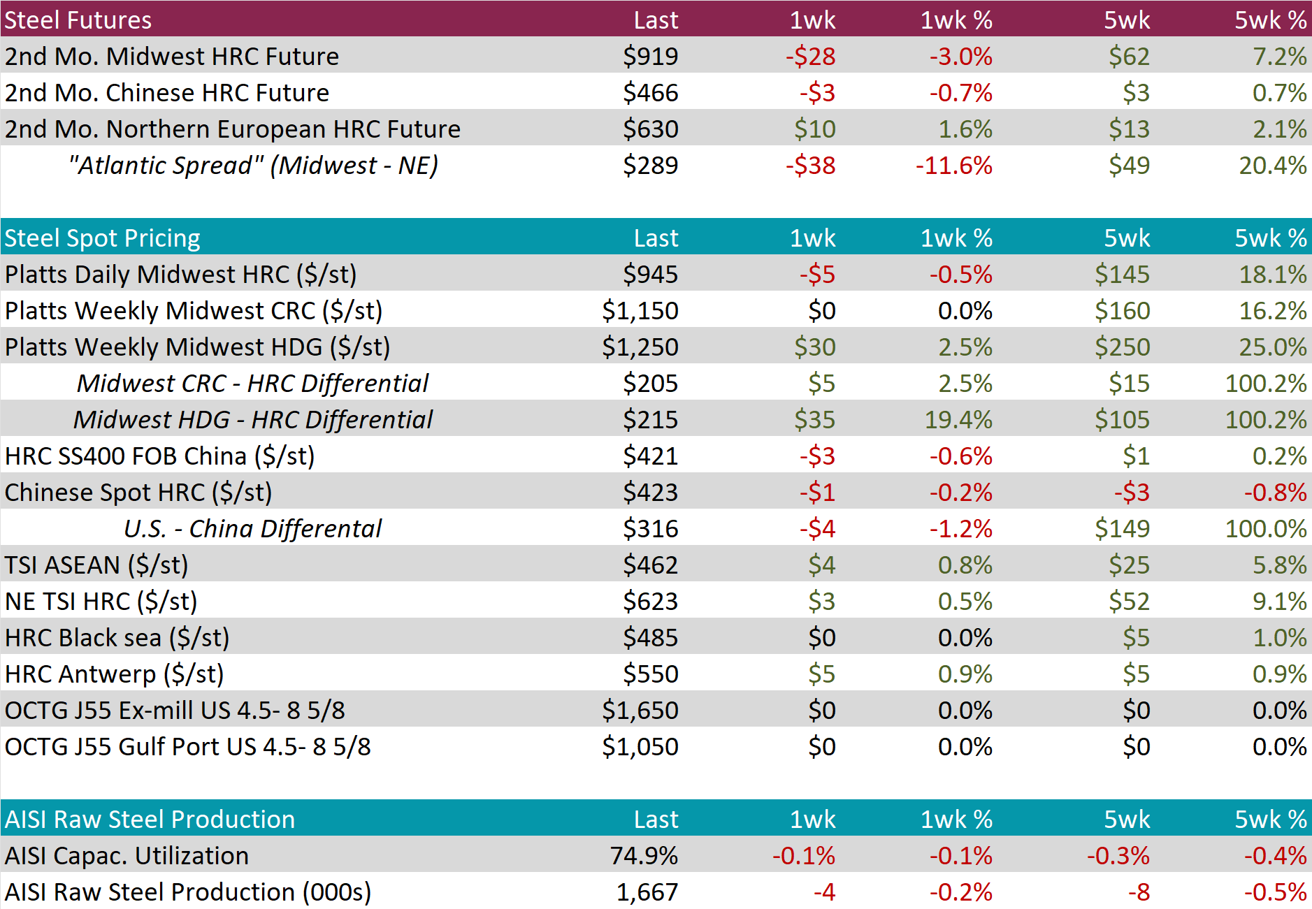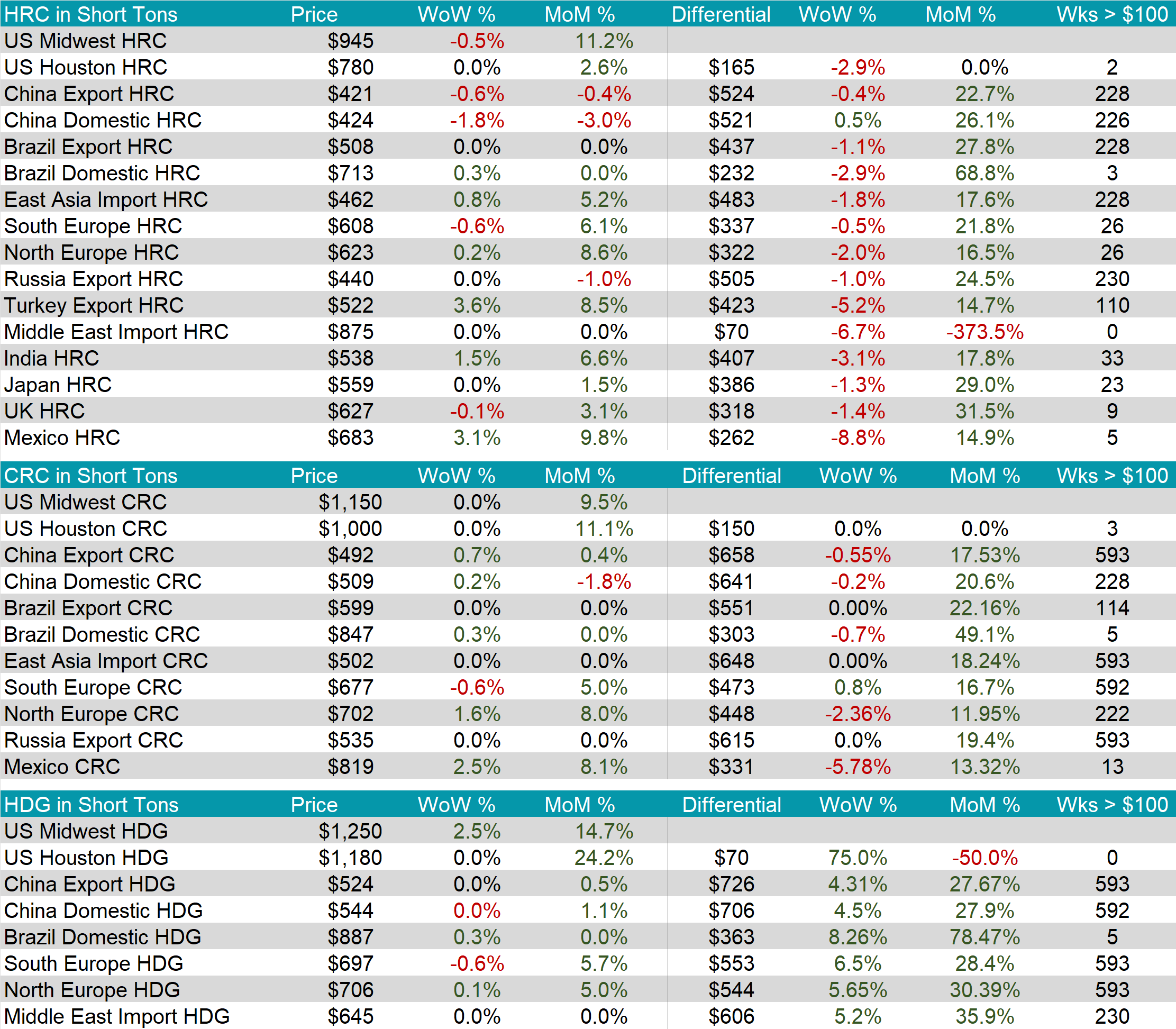 Differentials mainly contracted. Notable price changes were from: China Export HRC down by -0.6%, Korea HRC up by 0.8%, Turkey Export HRC up by $3.6%, and Mexico HRC up by 3.1%.