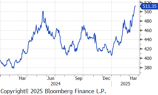 Copper futures jumped $18.80 (3.8%) to $511, nearing record highs amid U.S. tariff speculation and China’s stimulus measures. A recent executive order by Donald Trump investigating copper imports has fueled expectations of a 25% tariff, prompting higher premiums and accelerated shipments, tightening supply elsewhere. Structural constraints, including underinvestment in mining and limited refining capacity, persist as demand surges due to EV growth, AI advancements, and the renewable energy shift. Meanwhile, China’s 5% GDP growth target and fresh economic stimulus further strengthen copper’s bullish outlook.
