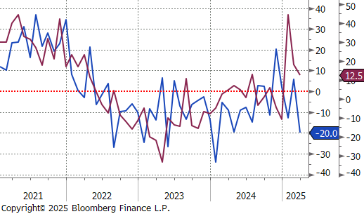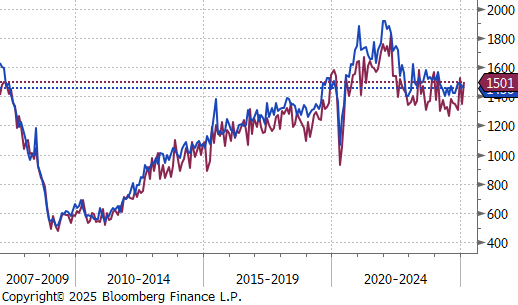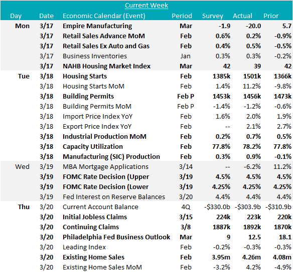 The March Fed Manufacturing Surveys from this week, both declined to varying degrees, Empire (NY) showed a significant contraction, printing down to -20, versus an expected decline to -1.9. Philadelphia, on the other hand, remains in expansion territory, printing at 12.5, down from the February reading, but above the expect level of 9. Furthermore, 6-month outlook for both moved sharply lower to their lowest levels since the end of 2023, while still slightly in expansion territory. More encouragingly, the FED Industrial Production data came in significantly above expectations in February, increasing 0.7% MoM, well above the expected 0.2% rise. This was primarily driven by Manufacturing output, up 0.9% MoM, sharply rebounding from last month -0.1% decline, and above the expected 0.3% increase.