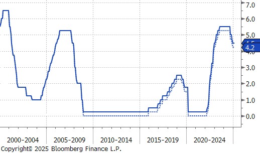 Finally, the FOMC (Federal Open Market Committee) met this week, and left FED Funds Interest Rates unchanged at 4.25-4.5%, as expected. The SEP (Summary of Economic Projections) & Dot Plot is where the real intrigue was, with two rate cuts priced in for this year (unchanged), though the distribution leans hawkish, suggesting the possibility of fewer cuts. Growth expectations were revised down to 1.7%, while inflation and unemployment forecasts rose to 2.7% and 4.4%, respectively. We remain confident in the view that when it is all said and done, one rate cut is the max for this year, and none is the most likely outcome.