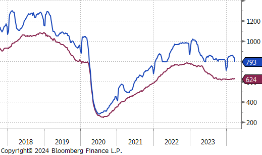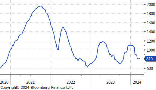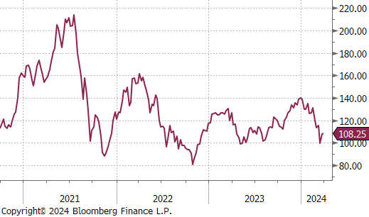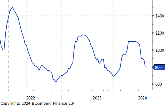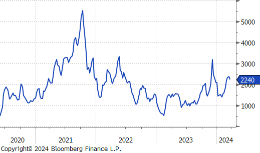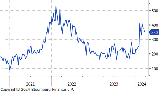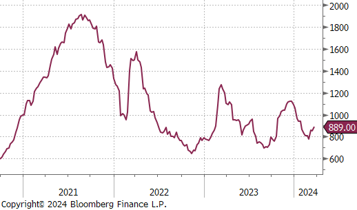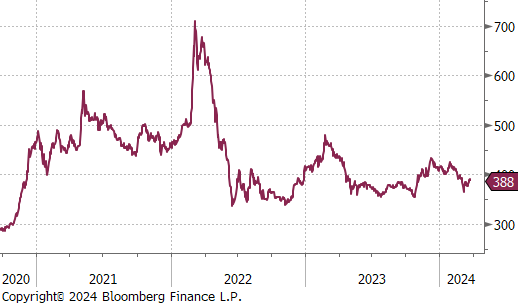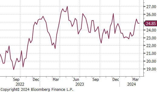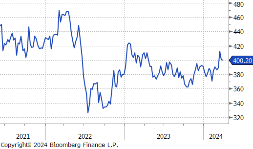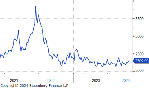 Copper fell by $11.70 or -2.8% to $401, backing down from a near one-year high, amidst renewed concerns over the Chinese economy and its pressured property sector, overshadowing recent positive economic data. Despite a faster-than-expected rise in China’s February industrial output, fears of diminished demand for goods and housing dampened expectations for the country’s commodity consumption. A significant 20% increase in China’s copper stockpiles for the week ending March 15th highlighted a restocking trend, yet underscored concerns, evidenced by a notable decrease in the Yangshan copper premium. However, copper futures managed a 5% monthly increase, supported by strategic production cuts from smelters facing raw material shortages and operating losses.