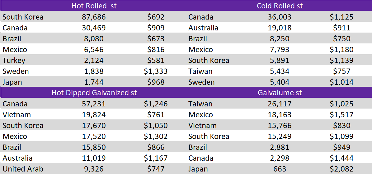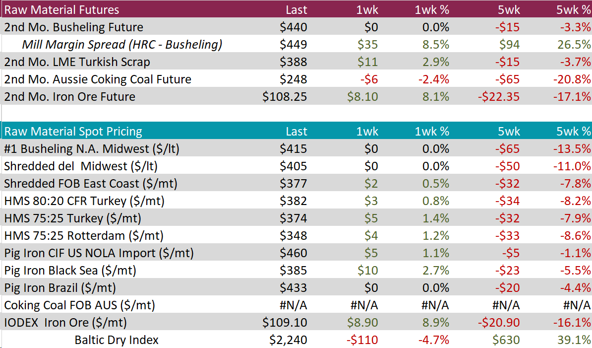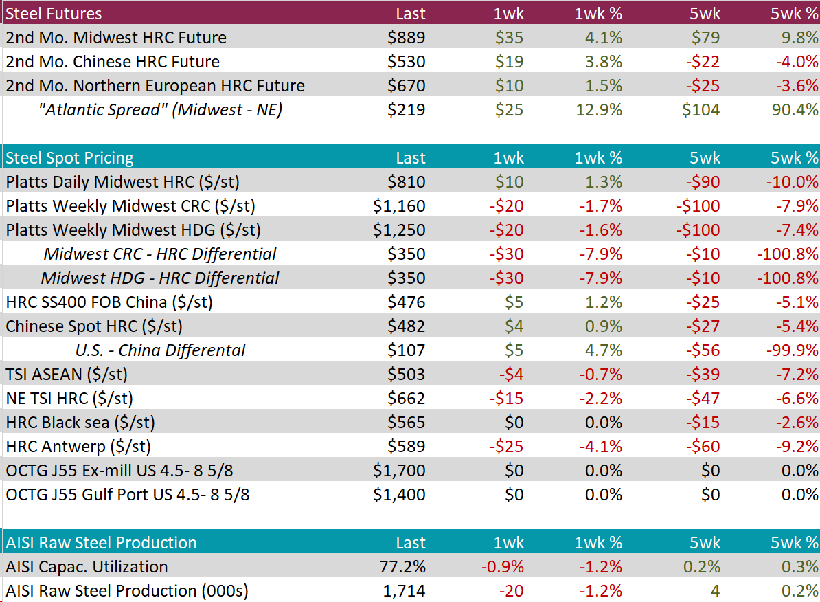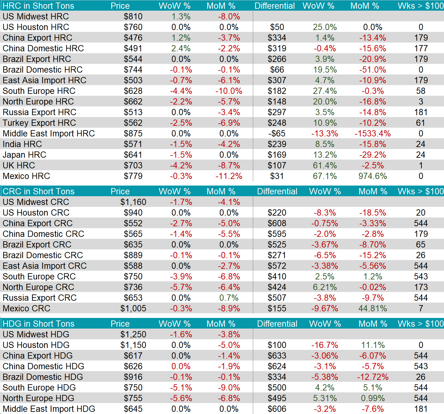 Tandem products both fell by $20, resulting in the HRC – HDG Differential to decrease by $30 or -7.9% to $350.