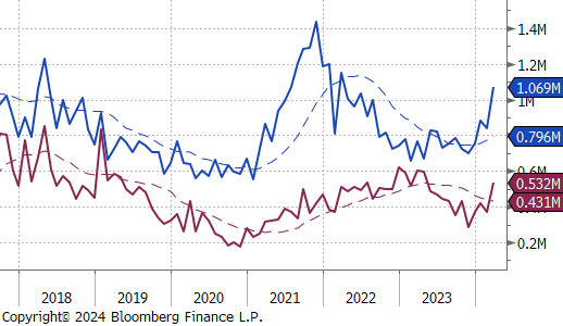 Outside of FED speak, we received the first round of monthly housing data. Building permit beat expectations, rising 1.9% versus an expected 0.5% increase. Housing starts also came in better than expectations, up 10.7% versus 8.2%. Furthermore, the NAHB (Builders) housing market index climbed to 51, surpassing the expected 48 print and reaching its highest level since July of last year. Existing home sales also came in quite strong, increasing 9.5% versus an expected drop, down 1.3%. This is the highest level of existing home sales since February 2023. This data points to a stable and growing housing market with a solid pipeline for continued activity