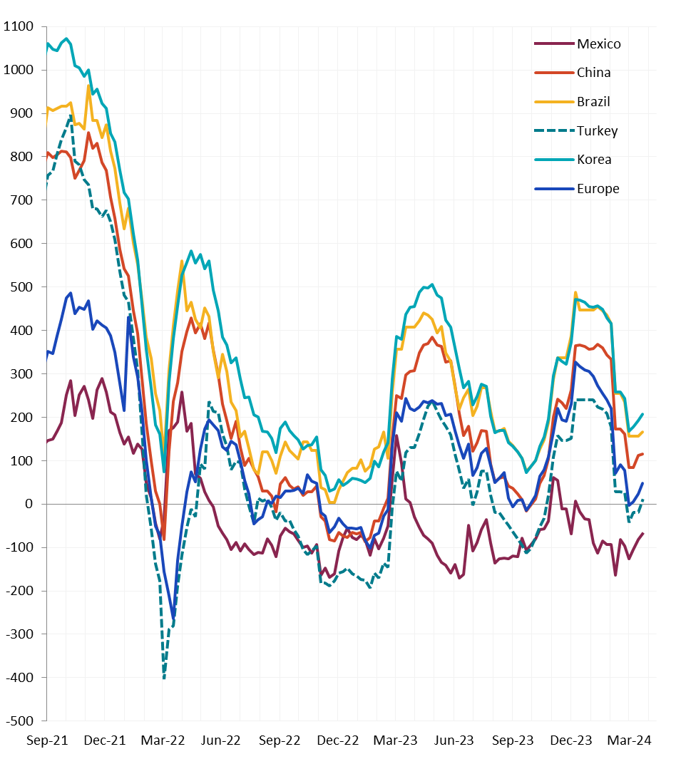 Watched global differentials all mostly widened, with China Export and Domestic HRC increasing by 1.2% and 2.4%, respectively. Other notable countries were South Europe HRC falling by -4.4% and UK HRC down by -4.2%.