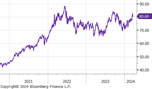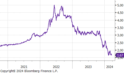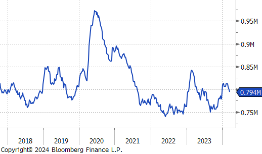 Our interpretation of this tranche of data is that the FOMC members see the risks to price stability and fully employment as equally balanced – meaning although the last leg of inflation moving down to the 2% target may take longer than initially expected, the risk of high interest rates to the labor market is more significant than the risk of reigniting inflationary pressure. The market and the FED are now in line with three cuts this year (beginning in June). Internally, our view of the risks leads us to believe this will be too soon and too many.