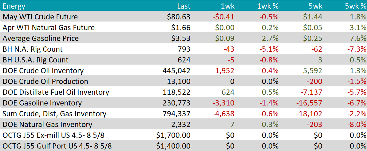 The Baker Hughes North American rig count substantially dropped by 43 rigs, bringing the total count down to 793 rigs. At the same time, the US rig count also experienced a reduction, taking off-line 5 rigs, bringing the total count to 624 rigs.