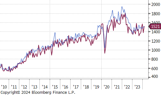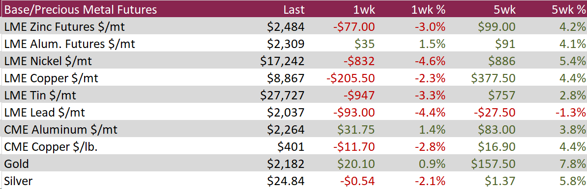 Mill production significantly pulled back after reaching its highest level in nearly 6 months, with capacity utilization ticking down by -0.9% to 77.2%, bringing raw steel production down to 1,714m net tons.