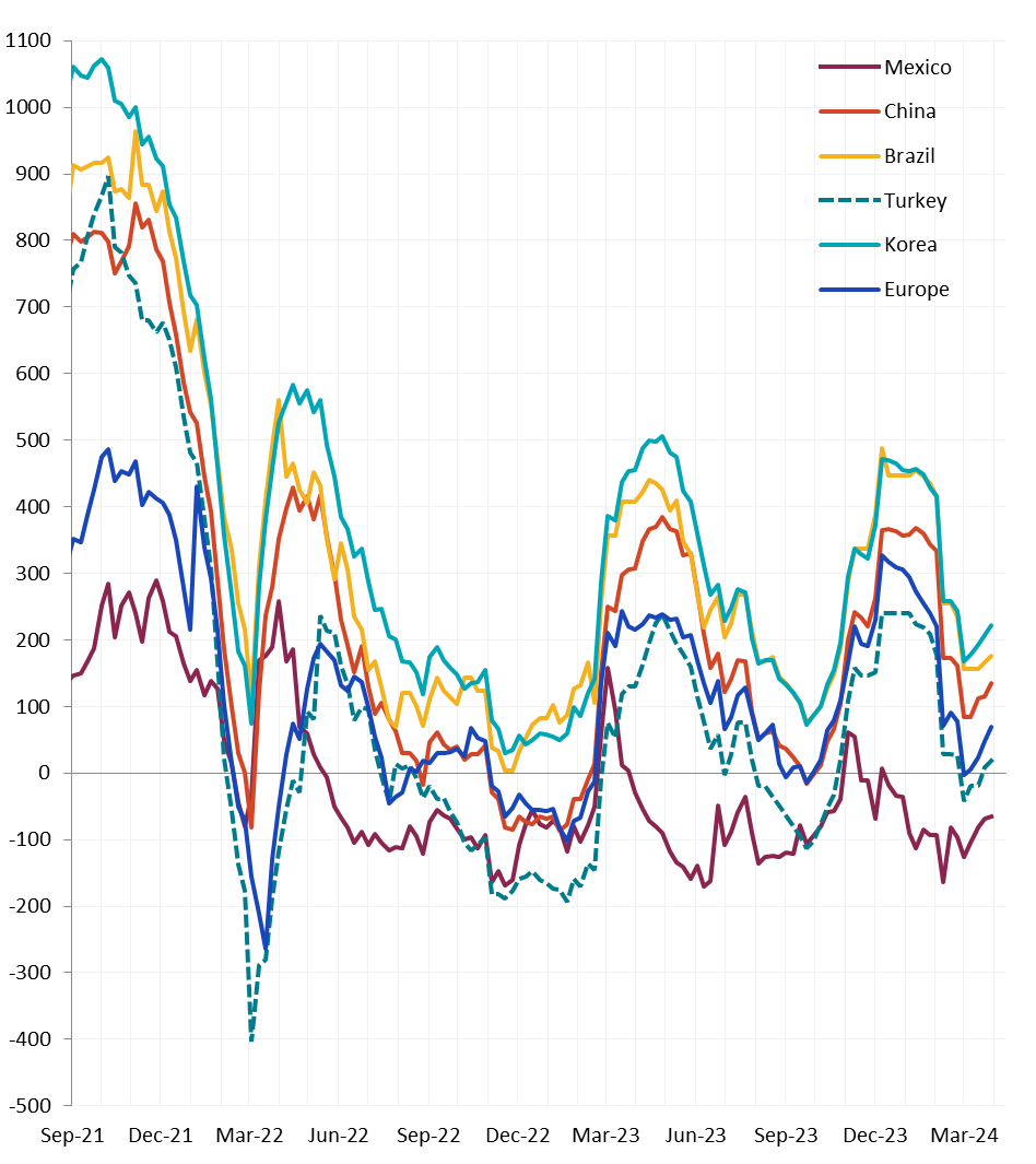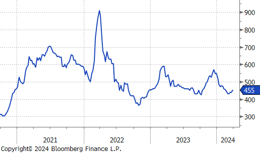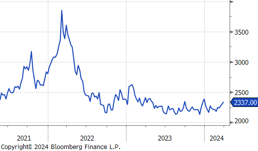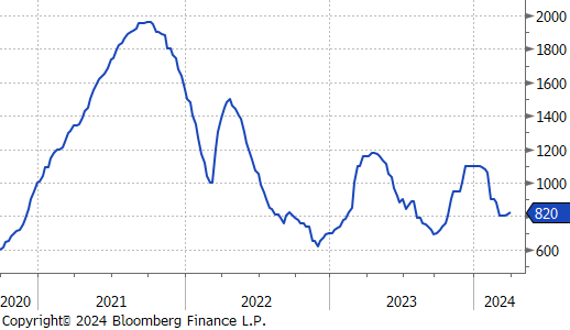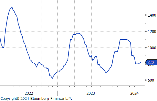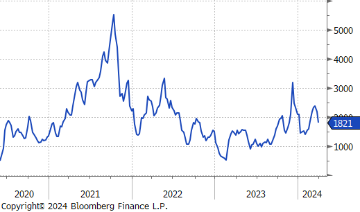 **While the uptrend remains intact, the initial estimate for Feb/Mar was reduced by ~160k, last week. This suggests those tons are being impacted by continued supply chain disruption from earlier in the first quarter.