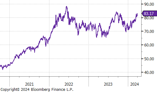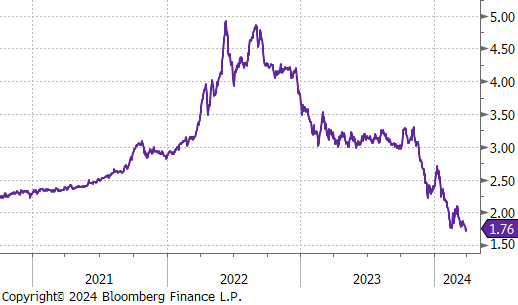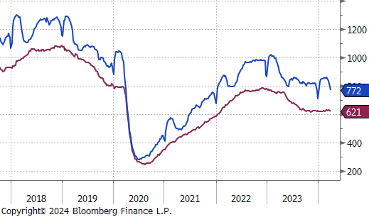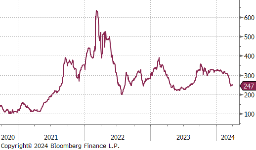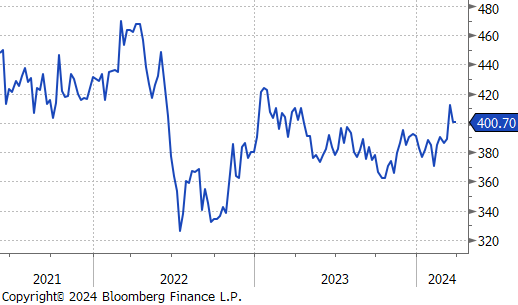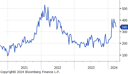 4Q23 GDP revised higher, driven by more robust consumer spending, which appears to remain strong well into the first quarter, with real personal spending from (PCE Report) up 0.4% in February. Looking more closely at that report, the Topline and Core PCE prints came in line with expectations, at 2.5% and 2.8%, respectively. Both continue to trend lower but are above the Fed target. It is important to note that the disinflationary base effect which encouraged markets that prices were under control will start to subside once we have cleared the summer months and will start to be a hurdle in getting PCE to 2%.