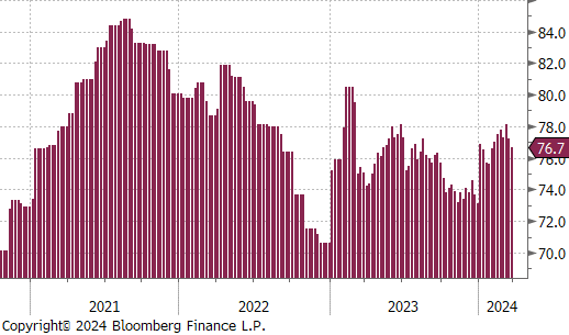 Mill production continued to scale back, with capacity utilization ticking down by -0.5% to 76.7%, bringing raw steel production down to 1.703m net tons.