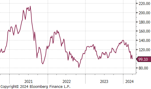 The 2nd month iron ore future dropped by $9.15 or -8.5% to $99.10, falling below the $100 price level for the first time since May 2023.