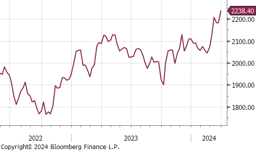 Gold jumped up by $56.80 or 2.6% to $2,238, hitting new highs as weaker-than-anticipated U.S. inflation figures solidified expectations for the Federal Reserve to begin reducing interest rates in June. The inflation data, indicated that the PCE price index, the central bank’s preferred inflation measure, increased by 0.3% in February. This marked a slowdown from the revised 0.4% rise in January, which had aligned with analysts’ predictions. Despite this, Fed Chair Jerome Powell emphasized on Friday that the central bank is not rushing to lower rates, noting that the latest inflation metrics align with the Fed’s objectives. Market sentiment now leans heavily towards a near 70% probability of the Fed initiating rate cuts in June, with expectations set for a total reduction of 75 basis points throughout the year. The anticipation of lower interest rates enhances the attractiveness of gold as an investment, as it lowers the opportunity cost associated with holding the non-yielding asset.