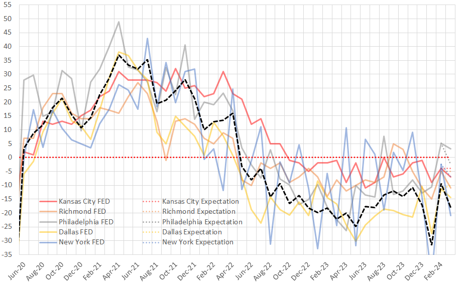 March’s Fed manufacturing surveys disappointed compared to market expectations and showed overall declines across the board. There were signals of a burgeoning recovery in the first two months of the year. This move appears to be a cautionary tale for optimism driven solely by hopes of impending interest rate cuts, when you dig into the commentary.