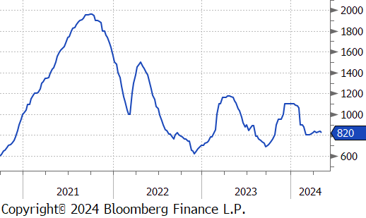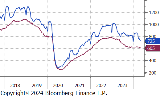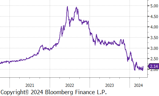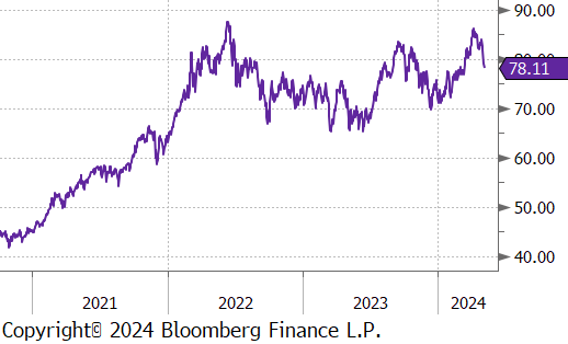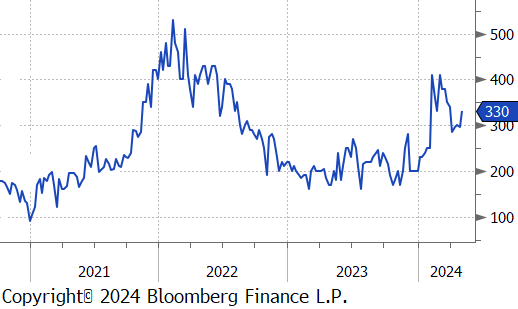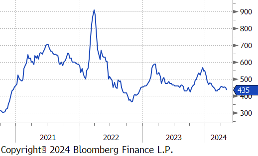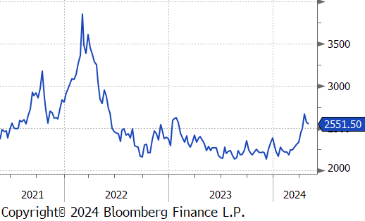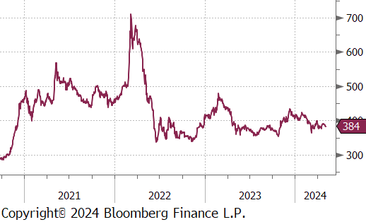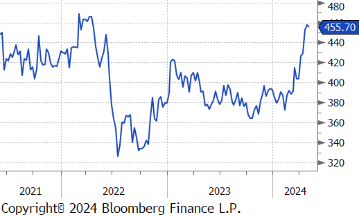 Copper edged down, declining by $1.70 or -0.4% to $456. The pause in the rally reflects market evaluations of supply threats and robust long-term demand prospects. Disruptions include the suspension of operations at Cobre Panama, the world’s largest open-pit copper mine, and power shortages impacting key mines in Zambia. Additionally, reduced profit margins for Chinese smelters could result in a coordinated 10% reduction in this year’s output. High costs associated with developing new mines have prompted industry players, like BHP’s recent bid to acquire Anglo American, to engage in mergers and acquisitions rather than start new projects. On the demand side, copper’s essential role in electrification continues to support a bullish long-term outlook.