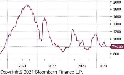 The 2nd month busheling future fell by $15 or -3.3% to $435, continuing last weeks price decline and hitting its lowest price in eight-weeks.