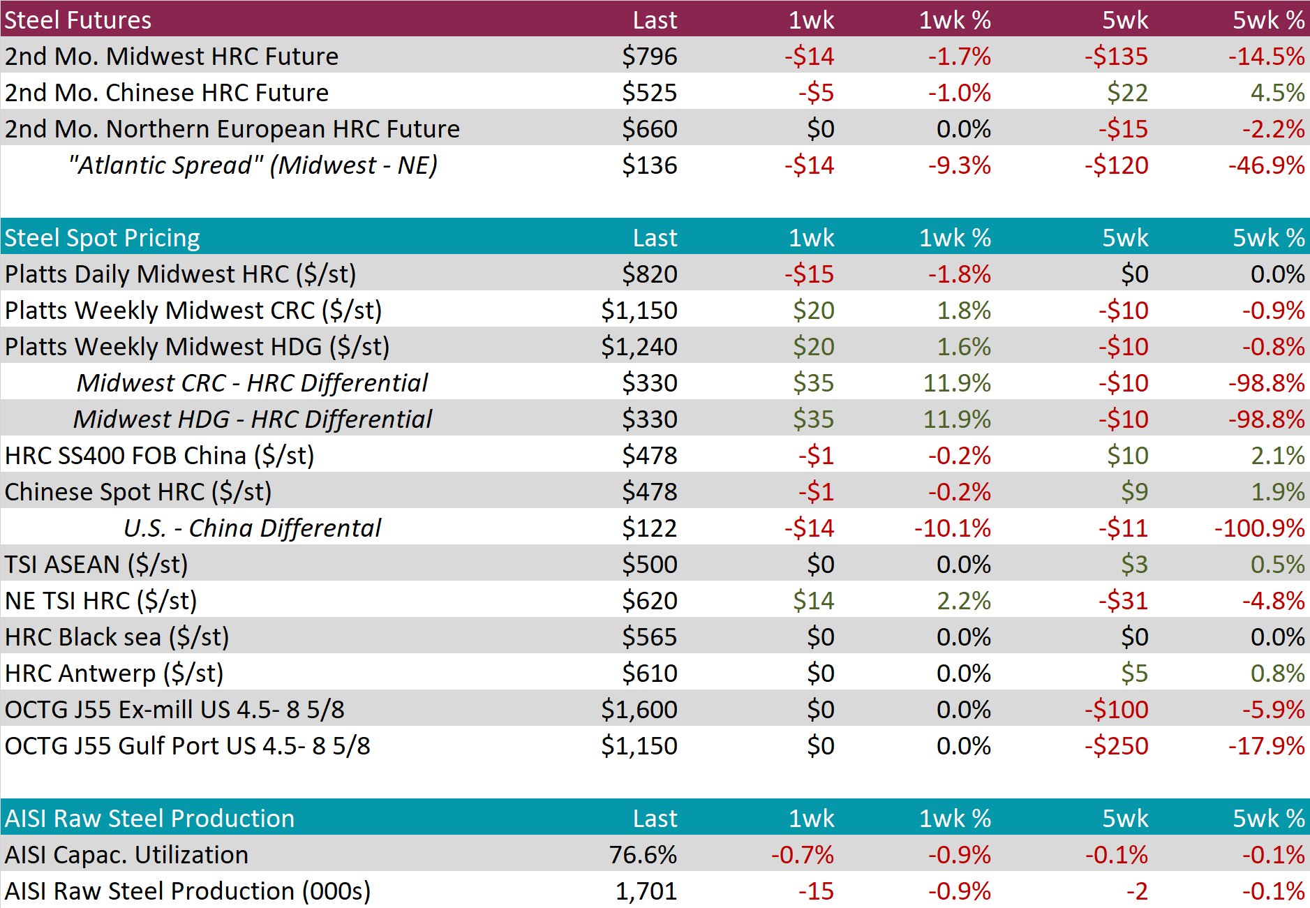 The HRC spot price fell by $15 or -1.8% to $820, reaching the lowest price in five-weeks. Meanwhile, the 2nd month future declined by $14 or -1.7% to $796, marking a total price decrease of $135 since its recent downward trend began five-weeks ago.