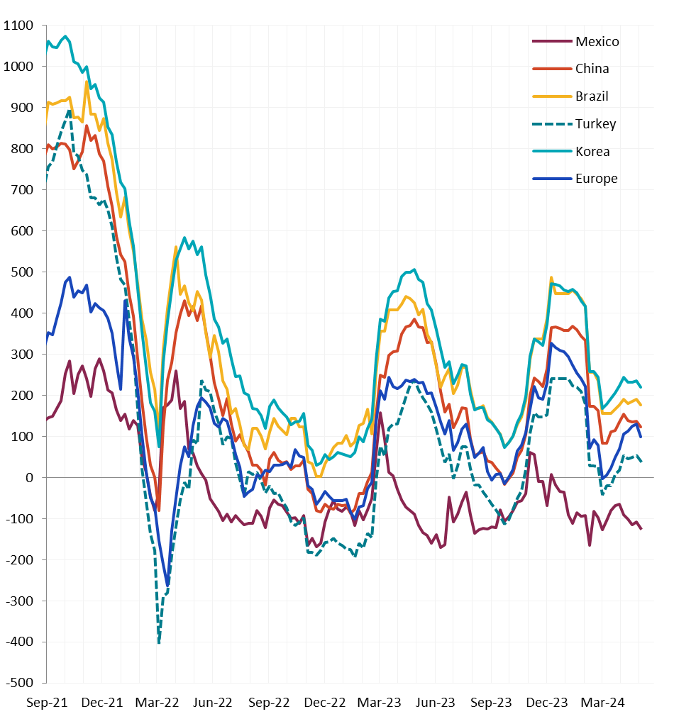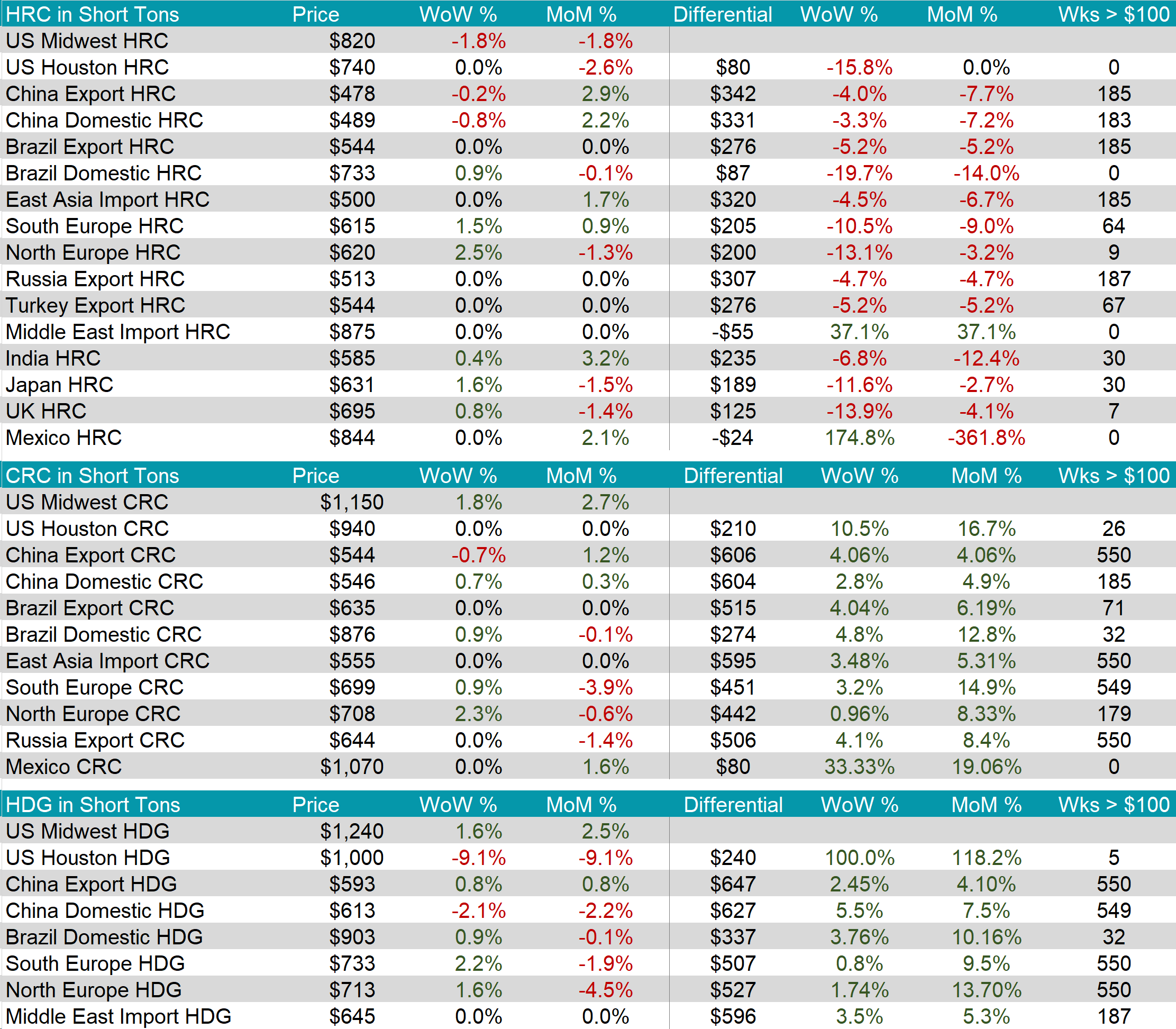 All watched global differentials shrank this week, except for Mexico. Europe HRC experienced the biggest price increase, which was by 2.5%. Meanwhile, China Export and Domestic HRC declined by -0.2% and -0.8%, respectively.