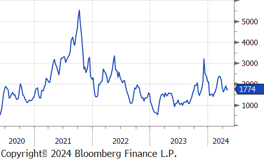 The Baltic Dry Index experienced an uptick, climbing up by $53 or 3.1% to $1,774, marking a slight rebound after notably dropping from recent price high last week.