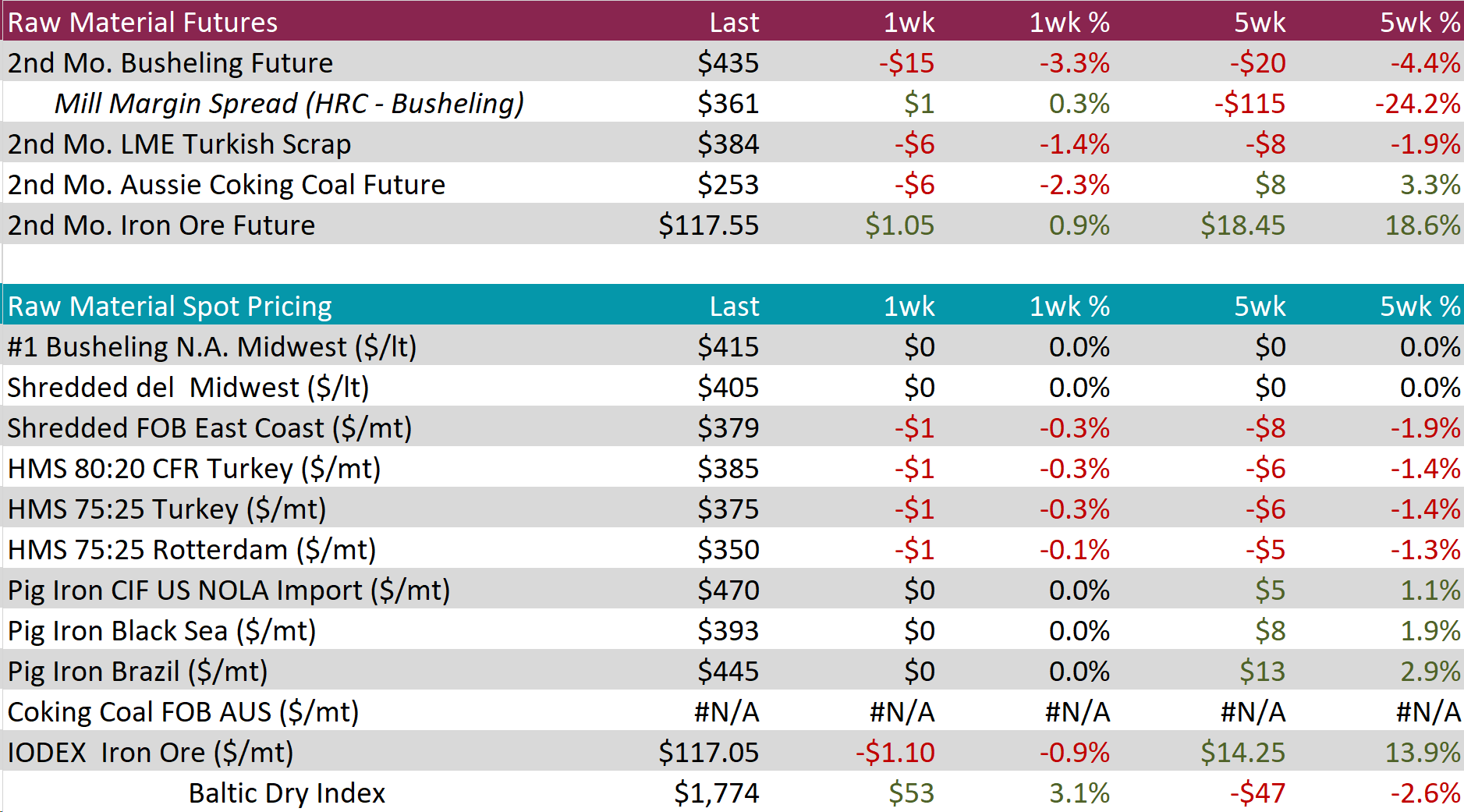 The 2nd month LME Turkish scrap future dropped by $6 or -1.4% to $384, retreating from the gains made over the past three weeks.