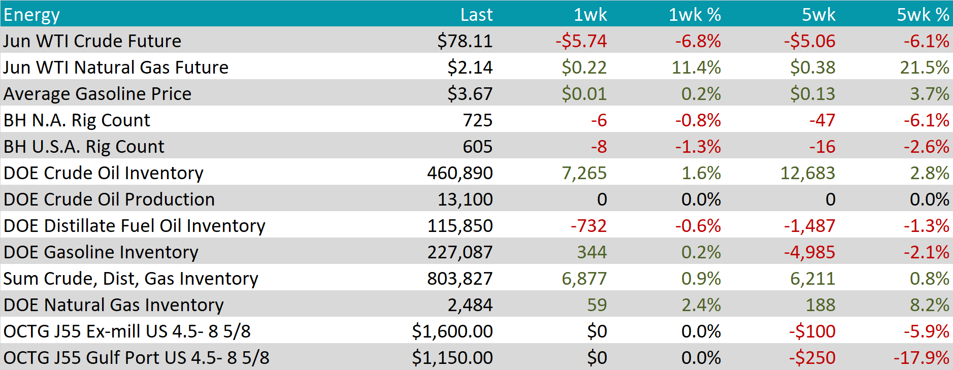 The Baker Hughes North American rig count reduced by 6 rigs, bringing the total count to 725 rigs. At the same time, the US rig count also declined, reducing by 8 rigs, bringing the total count to 605 rigs.