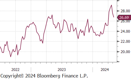 Silver fell to $26.69, mirroring a downturn in precious metals, driven by recent U.S. economic data that supports the Federal Reserve maintaining higher interest rates for an extended period. The employment cost index, a crucial indicator of wage trends, rose 1.2% in Q1, up from 0.9% in the previous quarter and surpassing expectations of a 1% increase. Together with the PCE data, this suggests persistent inflationary pressures and narrows the possibility for rate cuts by the Fed this year. Market expectations for the first rate cut have shifted to November from September. While high interest rates reduce the attractiveness of non-yielding assets like silver, the metal is still on track for a monthly gain of over 6%, bolstered by its dual appeal as a safe-haven asset and its industrial uses.
