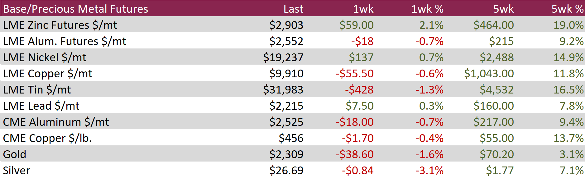 Aluminum fell by $18 or -0.7% to $2,552, continuing the drop from its recent price high, as Western sanctions on Russian metal continue to impact market availability. This restriction has exacerbated supply concerns, with fears that Western buyers might avoid purchasing Russian aluminum outside of LME contracts, anticipating future sanctions. In addition, the Aluminum Corp of China highlighted ongoing uncertainties regarding the country’s bauxite supply, primarily due to its reliance on Guinea, which has experienced disruptions following an explosion at a critical fuel storage facility. Furthermore, aluminum production in Yunnan, China’s fourth-largest aluminum-producing region, continues to face curbs during the annual dry season.