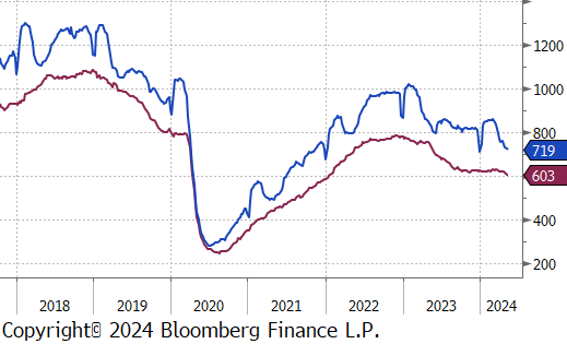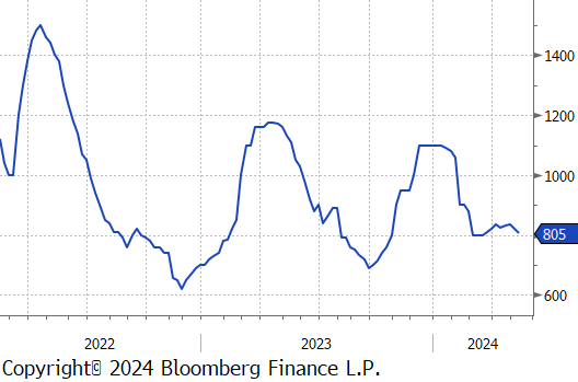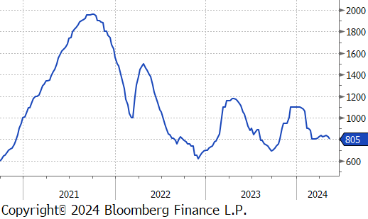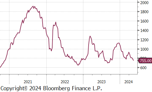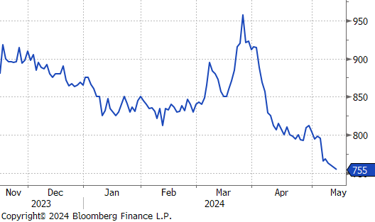 The HRC spot price declined further, falling by $15 or -1.8% to $805, hitting the lowest price in eight-weeks, and bringing the five-week price change down by $30 or -3.6%. At the same time, the 2nd month future dropped by $42 or -5.3% to $754, reaching its lowest price since September 2023.