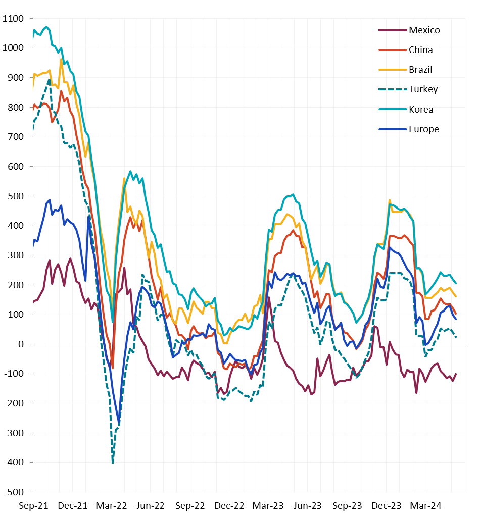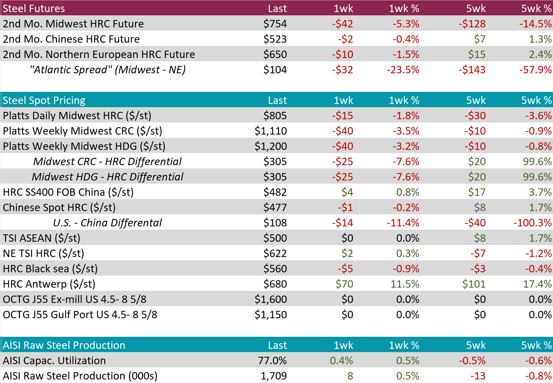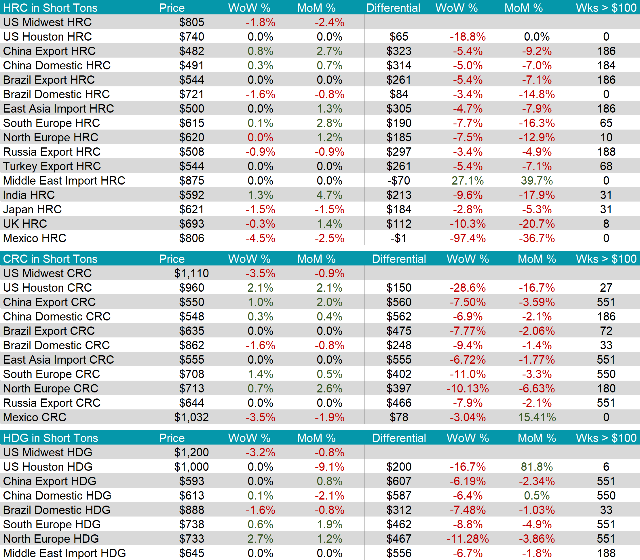 All watched global differentials contracted this week, with China Export HRC increasing by 0.8%, Mexico HRC declining by -4.5%, and Brazil Domestic HRC down by -1.6%.